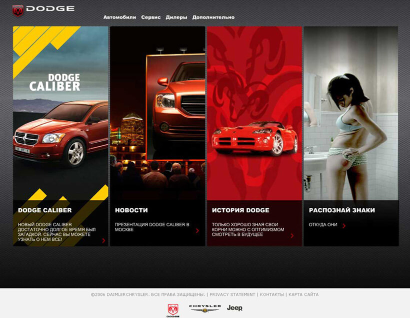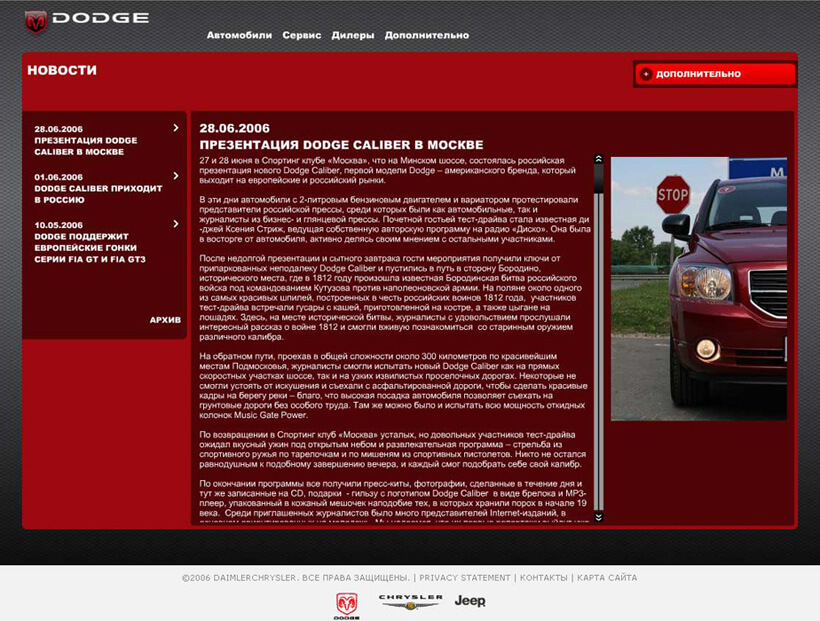 Сайт www.discoverdodge.com практически полностью выполнен на технологии флеш при использовании CMS сторонней компании, поэтому большую часть флеша пришлось перепрограммировать заново. Специалисты компании качественно разработали новые разделы, специфичные для русскоязычной версии сайта, локализовали материалы сайта, сделали новые иллюстрации.